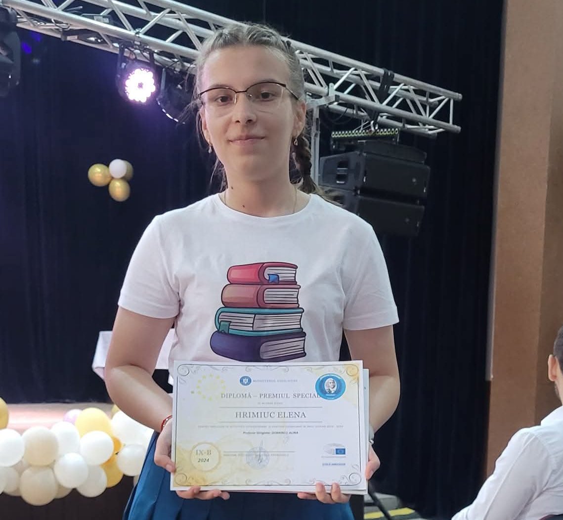 HRIMIUC ELENA, clasa a XI-a, premiul III la etapa județeană a Olimpiadei de Limba și literatura română, calificare la etapa națională, și mențiune la etapa județeană a Olimpiadei ”Lectura ca abilitate de viață”, prof. îndrumător Răileanu Manuela- Petronela