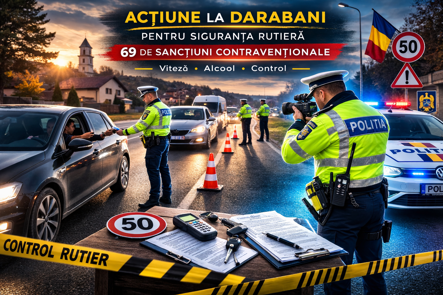 La data de 15 martie 2026, polițiștii din cadrul Poliției Orașului Darabani au organizat o acțiune amplă pentru prevenirea accidentelor rutiere, concentrându-se pe nerespectarea regimului legal de viteză. În cadrul acestei acțiuni, au fost legitimate peste 70 de persoane și controlate 70 de autoturisme, rezultând 69 de sancțiuni contravenționale în valoare de aproximativ 47.000 de lei.